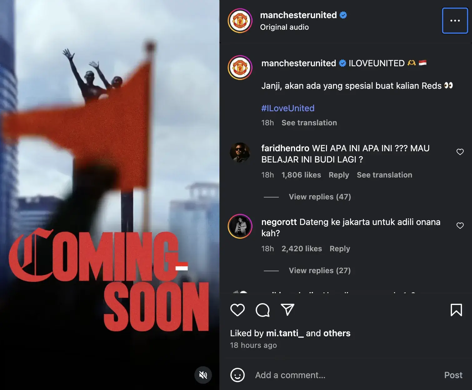 Parimatch News – Akun resmi @manchesterunited mem-posting teaser bertajuk “I LOVE UNITED” dengan caption berbahasa Indonesia: “Janji, akan ada yang spesial buat kalian Reds 👀” disertai tagar #ILoveUnited. Unggahan ini mengisyaratkan acara resmi klub untuk penggemar di Indonesia.
