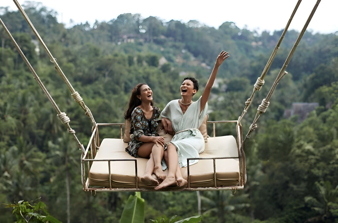 Dua perempuan menikmati ayunan di tengah pemandangan hutan tropis, tertawa bahagia bersama. Image Credit: Klaus Vedfelt / Getty Images