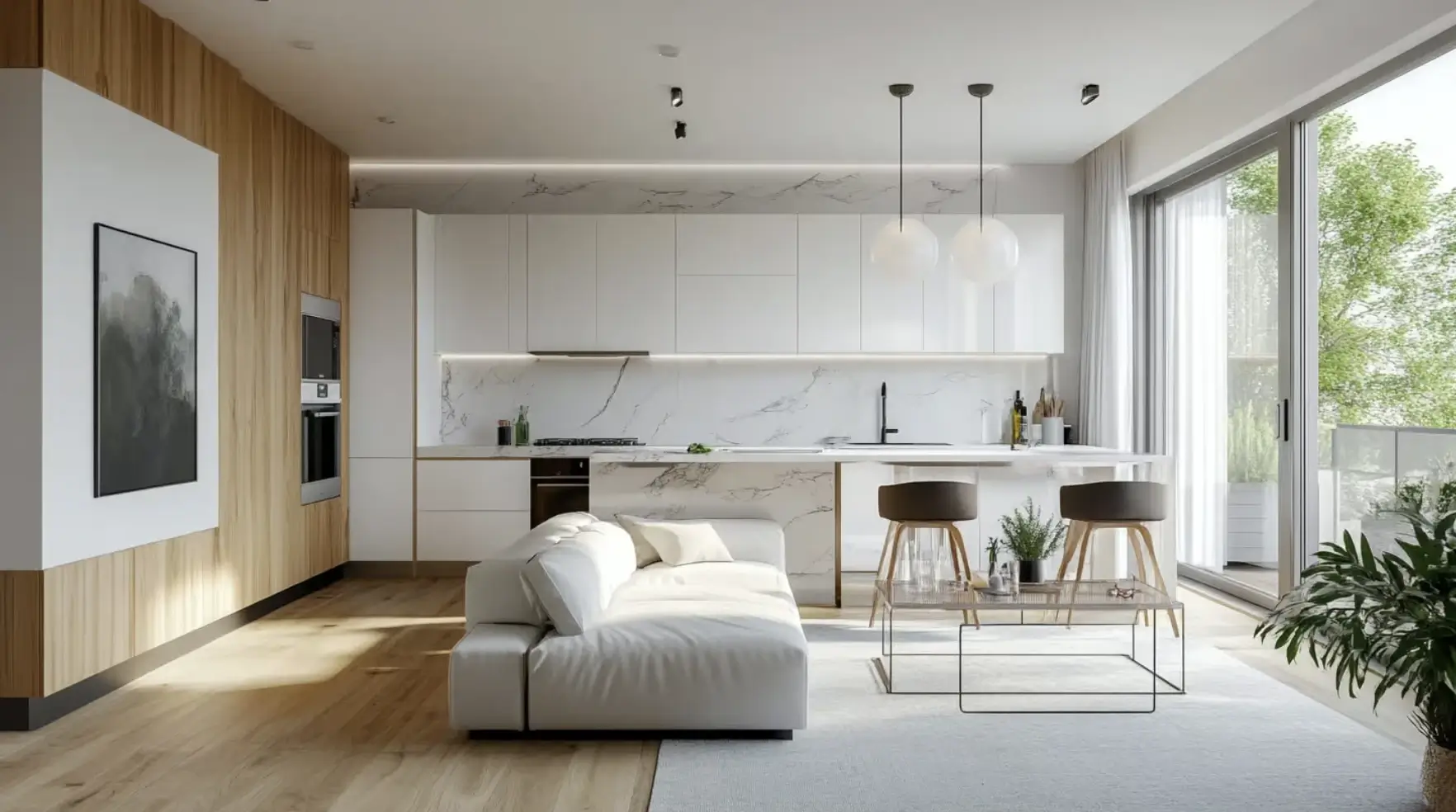 Ruang tamu bergaya open-concept dengan sofa modern, dapur minimalis, dan pencahayaan alami.