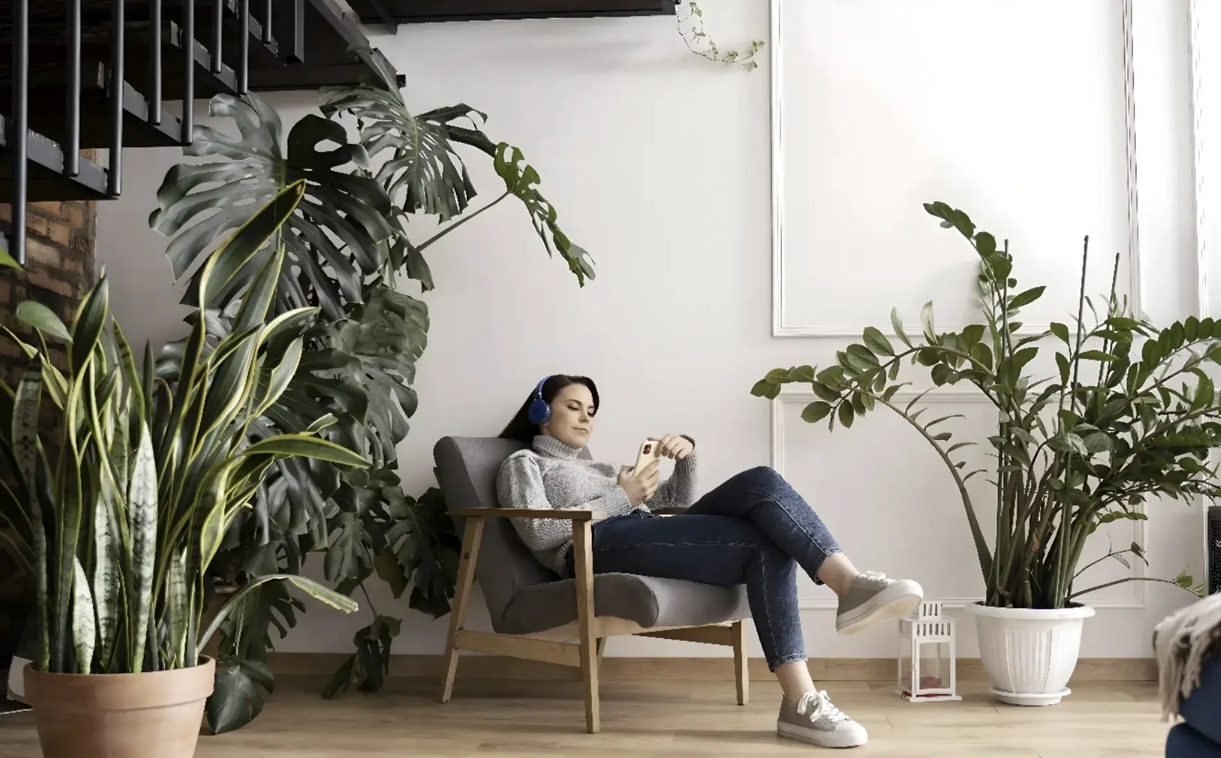 Perempuan bersantai di ruang minimalis dengan tanaman hijau, mendengarkan musik sambil menikmati waktu tenang.
