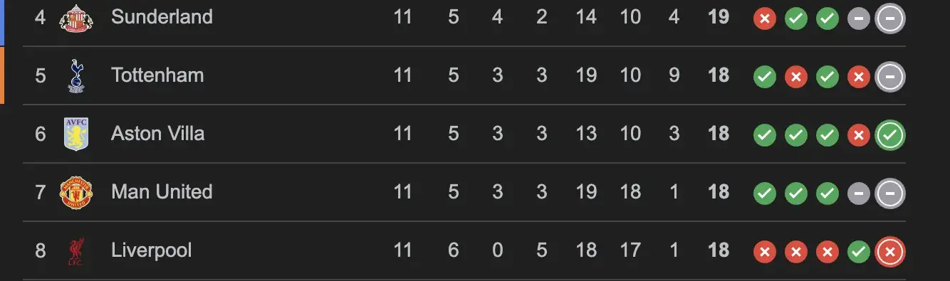 Liverpool FC kembali harus menghadapi kenyataan pahit di musim 2025/2026 Premier League. Setelah tampil impresif di awal musim, kini The Reds terlempar ke posisi kedelapan klasemen sementara dengan perolehan 18 poin dari 11 laga (Tempo, 10/11). Tim asuhan Arne Slot itu tertinggal delapan poin dari pemuncak klasemen Arsenal, serta berada di Manchester United, Manchester City, Chelsea, dan bahkan Sunderland yang menjadi salah satu kejutan musim ini (Bola.com, 10/11).