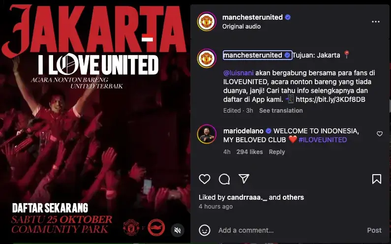 Meski pengumuman tersebut belum muncul di akun resmi Instagram Manchester United (@manchesterunited), I Love United sendiri merupakan program resmi klub yang sudah rutin digelar di berbagai negara. Sebelumnya, acara serupa pernah diadakan di India, Vietnam, Thailand, dan Malaysia, dengan konsep watch party besar-besaran yang melibatkan ribuan fans lokal. Acara ini akan bertepatan dengan laga Manchester United vs Brighton & Hove Albion, yang menjadi salah satu pertandingan penting dalam lanjutan Premier League. Para fans akan dapat menyaksikan pertandingan tersebut bersama ribuan penggemar lainnya di lokasi yang belum diumumkan secara resmi. Biasanya, pihak klub bekerja sama dengan sponsor dan komunitas suporter lokal untuk menentukan tempat terbaik yang mampu menampung jumlah pengunjung besar.