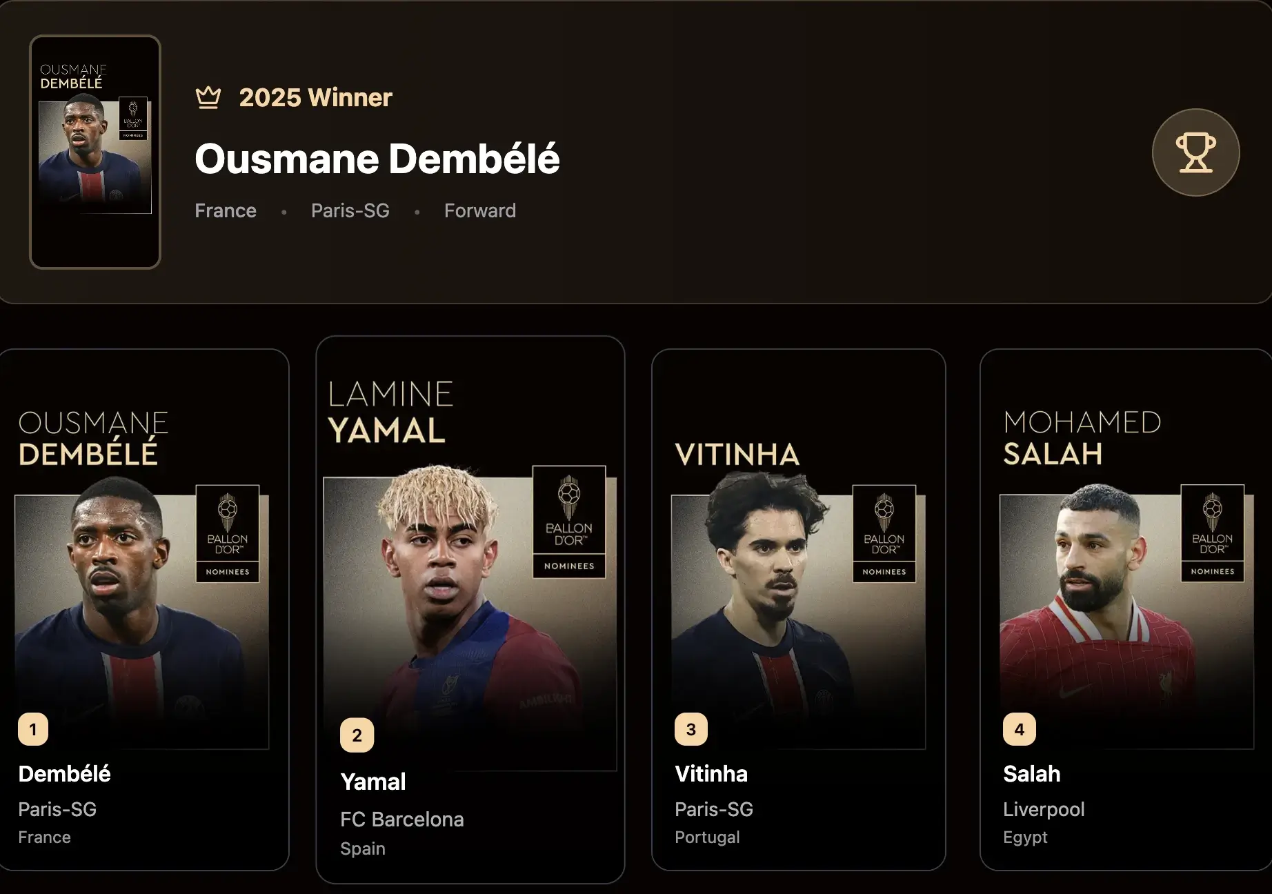 Musim ini ia HADIR di laga-laga penting dan mempertahankan level eksplosif dari awal hingga akhir musim faktor yang sering ditekankan analis jelang voting (Yahoo Sports, 23/09). Dembélé menonjol lewat keterlibatan langsung pada gol-gol krusial PSG saat menjuarai Liga Champions argumen yang berulang dalam liputan paska-seremoni (The Guardian, 23/09; VG, 23/09).
