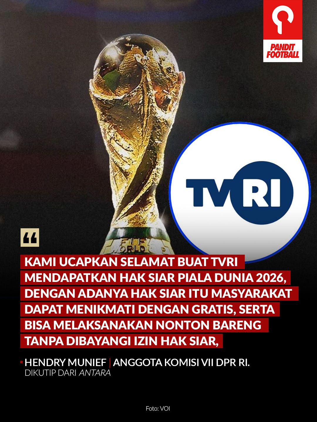 Piala Dunia selalu menjadi magnet terbesar bagi pecinta sepak bola di seluruh dunia. Kabar terbaru yang menggembirakan datang bagi masyarakat Indonesia: TVRI, televisi publik nasional, resmi menjadi pemegang hak siar Piala Dunia 2026. Dengan demikian, seluruh masyarakat dapat menyaksikan pertandingan secara gratis, tanpa hambatan berlangganan layanan berbayar (tirto.id, 01/10).